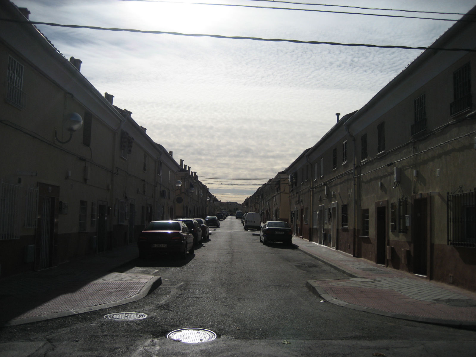 Estamos caminando por la calle Gallur. Nos dirigimos hacia El Tercio, unos chalets que se construyeron para los legionarios. Cuando llegó la democracia los expropiaron. Son las doce del mediodía y cae una luz rara, blanquísima, costera; esta foto parece tomada en verano, pero nos estamos congelando: