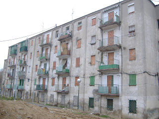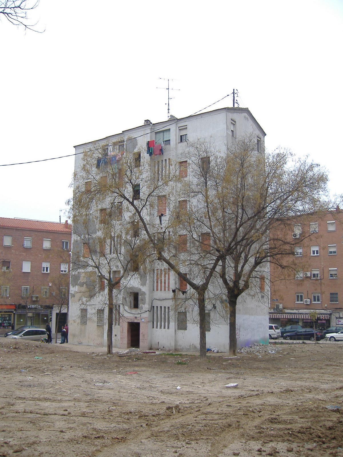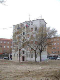 Las arquitectas van a presentarse a un concurso público. El Ayuntamiento ha derribado casi todos los edificios de las colonias San Francisco Javier y Nuestra Señora de los Ángeles para crear un ecobarrio. Copio: "Albergará (el ecobarrio) 2.069 viviendas de protección pública que contarán con energías renovables para su funcionamiento, como el biogás, gracias a que la Junta de Gobierno aprobó el proyecto de urbanización del Plan de Reforma Interior (PERI) de la zona". Las arquitectas me explican y yo tomo nota. De lo que apunto, me interesa esto: "Es un vacío entre retículas. Las estructuras las dan." "Extrañas siluetas de las parcelas, a las que se tienen que adaptar los edificios; extrañas porque son irregulares." "Lo de alrededor tiene 3 alturas, y proponen 8." "La gente ve las chimeneas y se asusta." Las arquitectas están conmigo cerca de una hora. Luego se van a La Latina a comer cocido, y yo marcho a fotografíar el solar. Para llegar he de recorrer la calle del Payaso Fofó, que es muy larga, y donde hay edificios de los que yo llamo ilegítimamente "costeros", como éste: