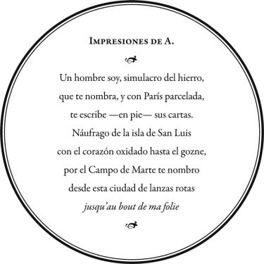 Participo con este poema junto a los autores y astistas gráficos Julieta Lahoz, Rrose Selaby, Grassa Toro, Alejandra Acosta, Alfonso Brezmes, Daniel Hernando, Carla Nicolás, Daniel Rabanaque y Clemente Calvo en el número 7 de Poisson soluble, pasquín literario y de arte visual realizado en Zaragoza, coordinado por Pierre D. La e inspirado en el surrealismo y otras vanguardias artísticas. El número está dedicado a la figura del inclasificable Raymond Roussel, autor de obras como Locus Solus (1914), y cuyo trabajo influyó de manera notable en los surrealistas o el nouveau roman. En cuanto a mi poema, el primero que publico en papel (un estreno que me alegra haber experimentado en un objeto de arte como este pasquín), he tratado vagamente de "jugar según las reglas" del propio Roussel, descritas en su libro Comment j'ai écrit certain de mes livres (1935), por lo que me he apartado de la línea de mi primer poemario (en el que llevo trabajando unos meses y donde, por ejemplo, no utilizo la rima). El título está inspirado en la obra Impressions d’Afrique (1910), de Roussel. Reproduzco la maquetación original del pasquín, que desde hace unas semanas podéis encontrar en librerías y librerías de arte de varias ciudades.