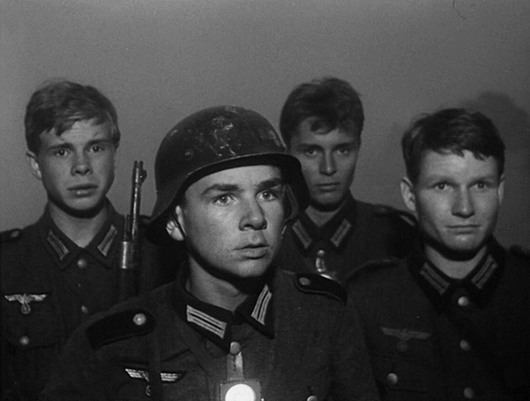 La película está dividida en dos partes. En la primera, se muestra la dura cotidaniedad de la población civil alemana que sufrió lo indecible durante los últimos meses de la WWII. El director alemán Bernhard Wicki acierta al no recrearse en el melodrama ni pasarse de costumbrismo para apostar por un tono más real, más seco y más crudo en el que, en unos pocos minutos, consigue mostrar, en forma de breves pinceladas, varios aspectos muy interesantes: la hipocresía de los dirigentes del partido, la relajación de las convenciones sociales (e incluso de los principios éticos) ante la que se avecina y su particular y autocrítico "yo acuso" a sus compatriotas que, en mayor o menor medida, contribuyeron a crear el monstruo que ahora lamentan: una juventud fanática que va camino de una inmolación sin sentido. Cierto es que Wicki necesita sacrificar muchos matices y recurrir a los arquetipos que personifican los siete jóvenes pero el resultado lo justifica y la capacidad de síntesis para contar tanto con tan poco es sobresaliente.