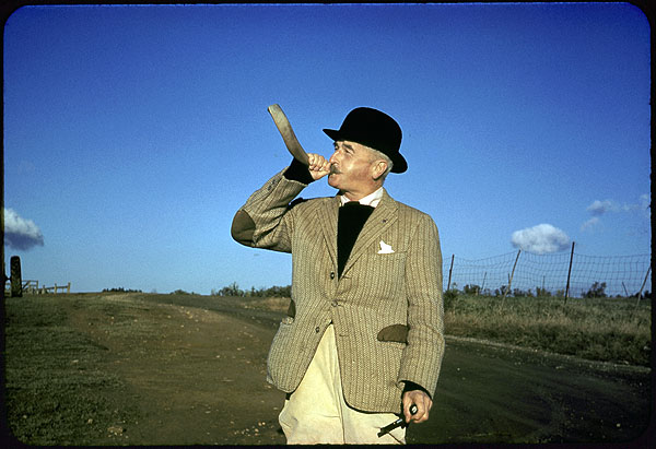 Aquí, don William soplando por el cuerno. [Photo by George Barkley of William Faulkner with hunting horn, at Farmington Hunt Club, 1960.]