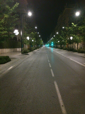Jamás he visto la Gran Vía de Granada enfundada en un silencio, una calma y una soledad tan absoluta. Paisajes como este es lo que confirma, una vez más, mi convicción de querer seguir trabajando de noche, detrás de una de las pocas puertas de cristal que permanecen iluminadas, envueltas en la negrura, como una luciérnaga rutilante y desorientada en la ciudad. Me quedé sin tabaco. Eran las cuatro de la madrugada. El trabajo estaba tranquilo así que salí a la calle en busca de algún quiosco o tienda de comestibles para poder comprar una cajetilla...Y aparecí en mitad de una Gran Vía detenida, nocturna y silenciosa. Parecía una calle que se mirara sus adentros, como reflexionándose.Me planté en medio de la carretera y agarré el teléfono para hacer esta foto. Son unos siete años los que llevo trabajando de noche, saltando de un lugar a otro.Y a pesar de las ojeras moradas, del cansancio que arrastro durante el resto del día y de las largas horas de mudez persistente, no renuncio a ella. Porque la noche tiene un movimiento de calendario lento y una soledad que inventa oscura relojería. Los semáforos cambian de color, una vez y otra, para nadie, sus siluetas de peatones parpadeantes son como bengalas que se lanzan en alta mar para ser devoradas por la oscuridad. Pensé que no hay mayor soledad que la de los muñecos luminosos de los semáforos invitando a cruzar o detenerse a nadie. La noche de la ciudad tiene algo de plomo líquido y frío que se desvanece durante el día. Por la noche se aprende a descifrar el blues que rueda por el asfalto ya silencioso, si pegas la oreja a la carretera puedes escuchar el bramido de coches y gomas que se ensordecieron durante la mañana. Me gusta la noche porque es de los gatos y las alimañas que durante el día dormitan por las alcantarillas. El día huele a betún, a talco sucio y zapatos nuevos. Por la noche es el temblor de los borrachos que sueñan que se atragantan en una lluvia sin fin.