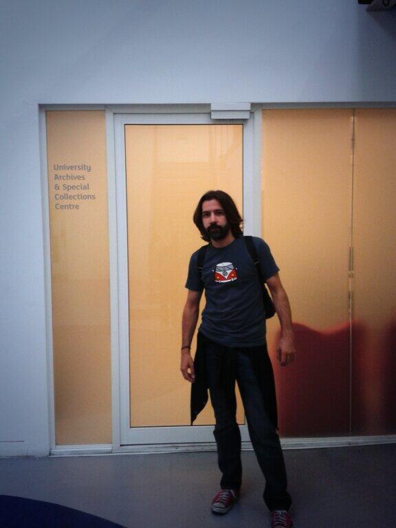 EL PRESENTE (mi experiencia): A mediados de agosto de este año, o sea, tan sólo hace un par de semanas, pasé unos días con mi familia en Londres. Mi objetivo primordial era visitar los Archivos de Stanley Kubrick porque yo aún no había visto el documental y pensaba que en la UAL tenían una exposición permanente de artículos relacionados con Kubrick y sus famosas cajas. Cuando llegamos al edificio (poco después de la sobremesa), con nuestro hijo dormido en el cochecito de paseo, y nos plantamos en la entrada, y mi mujer habló en inglés con uno de los tipos de recepción, lo primero que preguntó éste era si teníamos cita previa. No, no la teníamos. Ignorábamos que hubiera que pedir cita. Cogió un teléfono y habló con alguien y apenas un par de minutos después apareció una amable señora inglesa que atendió a mi mujer. La señora nos explicó que no era una expo, sino un archivo como tal, puesto a disposición del público, por supuesto, pero en realidad destinado a facilitar la labor de biógrafos, estudiosos e investigadores. Creo que el niño dormido le inspiró ternura, y supongo que vernos allí con el cochecito, con cara de cansados, con acento de extranjeros, con algunos bolsos al hombro… hizo que nos preguntara si queríamos echar un vistazo por curiosidad. Sí, queríamos echar ese vistazo. Antes de franquear la puerta, tuvimos que inscribirnos en el registro: nombres, teléfono, etc. La señora nos condujo hacia un ascensor, luego recorrimos un pasillo, luego bajamos por una escalera con el cochecito sujeto en alto por mi mujer y yo. Nada anunciaba lo de los archivos, no se veía el nombre de Kubrick por ninguna parte, como si todo aquello fuera secreto, como si estuviéramos en una versión reducida de los almacenes del final de En busca del arca perdida. Tras la escalera llegamos a una puerta blanca. Tras esa puerta, unas oficinas pequeñas y blancas, muy adecuadas, muy kubrickianas (se disciernen hacia el final del documental). Y, dentro, entre el silencio, sólo roto por el teclear de un par de oficinistas, algunas huellas del maestro: biografías y manuales sobre su obra, sus películas en dvd, algún que otro fetiche, e incluso la cabeza cortada y ensangrentada de un maniquí (se trata de la cabeza que utilizaron para el asesinato de una vietnamita de La chaqueta metálica, escena rodada pero no incluida en el montaje). Y también carteles de tres o cuatro películas de John Schlesinger. La señora nos dejó en manos de una chica. La chica nos dijo que tendríamos que consultar los archivos en un ordenador. Y luego registrar cada petición en un papel, como cuando antaño ibas a la biblioteca y aún no estaba todo informatizado: signatura, nombre del visitante, etc. Como temíamos que el niño despertara, me di toda la prisa que pude. El archivo está clasificado por películas, y cada película tiene subapartados y dentro de éstos hay otros subapartados, de tal modo que era jodido pedir un bloque de documentos (ejemplo: si querías fotos de Eyes Wide Shut, estaban divididas en imágenes de rodaje, de postproducción, de promo, etc). Al final me decidí por las notas manuscritas de Kubrick valorando algunos aspectos y detalles de la novela El resplandor de Stephen King, además de los planos del laberinto de la película, y fotos de rodaje de Eyes… y no sé si algo más. Las prisas y la emoción me bloquearon. Ahora sé que tendría que haber empezado por La naranja mecánica o Espartaco, que son las dos películas de SK que más veces he visto. Para revisar el material, que trajeron en grandes archivadores, tuvimos que ponernos guantes de látex. No nos permitieron hacer fotografías, ni siquiera de aquella oficina, así que cuando mi hijo crezca y le cuente la historia, no habrá pruebas tangibles. Aunque luego, al salir, mi mujer me hizo una foto junto a la puerta de esa oficina, donde sólo pone “University Archives & Special Collections Centre” (se puede ver al término de estas líneas). Estuvimos apenas unos minutos echando un vistazo a ese material, flipando porque SK lo guardaba todo (vi folios de A-4 que sólo contenían una o dos frases breves, meras observaciones sobre algún aspecto de la novela o del proyecto). Pero allí estaban: la letra del genio, sus papeles personales, su material… Los originales.