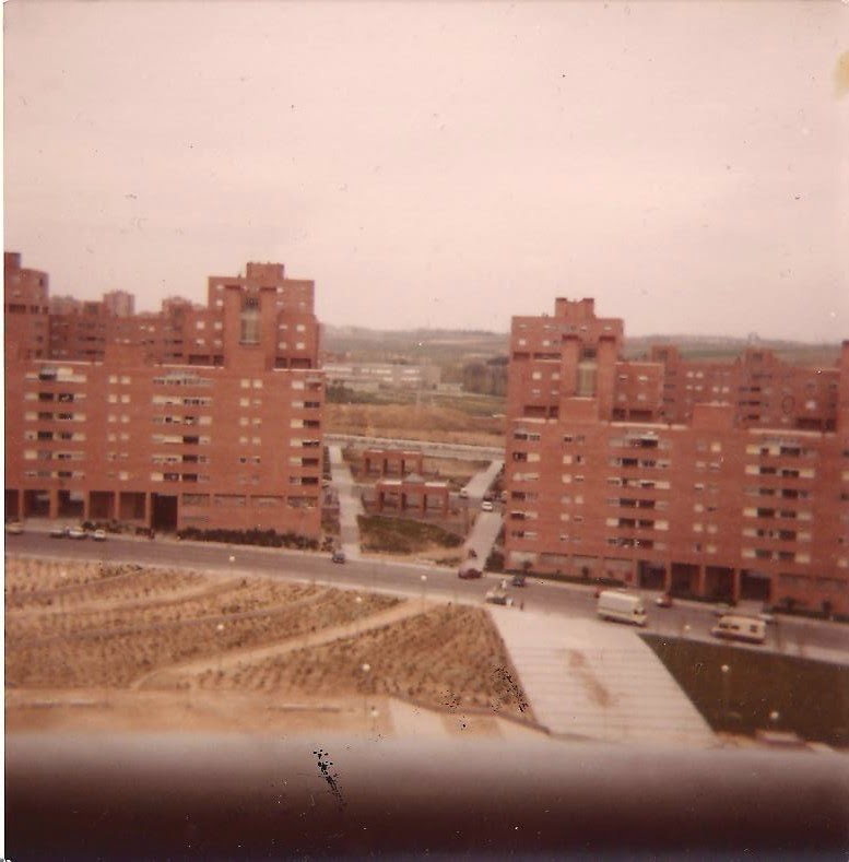 La fotografía es un clásico de los álbumes de fotos de nuestros padres, que se habían comprado el piso en el nuevo barrio, en los setenta o en los ochenta. Gracias a ella, durante estos últimos meses me he estado acordando de Charo y Jose. La foto era suya; me la dieron tras una comilona en su casa. No sé si la sacaron de la caja de los retratos prohibidos, en los que posaban bellísimos, tan los ochenta y tan en Madrid. Cuando vi esos edificios de la foto, con pinta de recién alzados, pregunté que dónde, y ellos me dijeron que no estaban seguros, pero que seguramente Vallecas y Palomeras. Ahora que sigo mirando la imagen mi atención se va de los edificios a los huecos, que me producen cierta sensación de libertad, como si en lugar de estar construyéndose, la ciudad hubiera estado desarmándose y el proyecto para el futuro hubiese consistido en dotar a la urbe de espacios que no estuvieran predefinidos, que sirvieran para lo que cada cual se inventara.