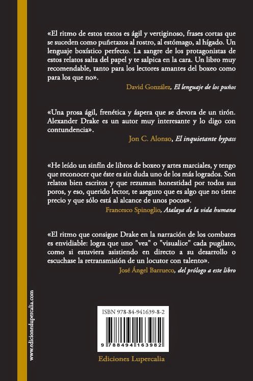 Lupercalia, una editorial que sigue apostando por escritores al margen, acaba de publicar la 2ª edición de los Ocho relatos de boxeo de Alexander Drake. Dado que escribí al autor para comentarle que me había gustado su libro, pronto me encargó un prólogo para esta nueva edición y por supuesto acepté. Y digo "nueva" porque, además de mi texto (que se puede leer en este post de David González), la ilustración de cubierta (obra de Enrique Cabezón, Kb) sale más clara, se ve mejor; y, por si fuera poco, en la contracubierta me citan junto a gente a la que admiro: David González, Jon C. Alonso, Francesco Spinoglio. Mi gratitud hacia Lupercalia y Drake por contar conmigo.