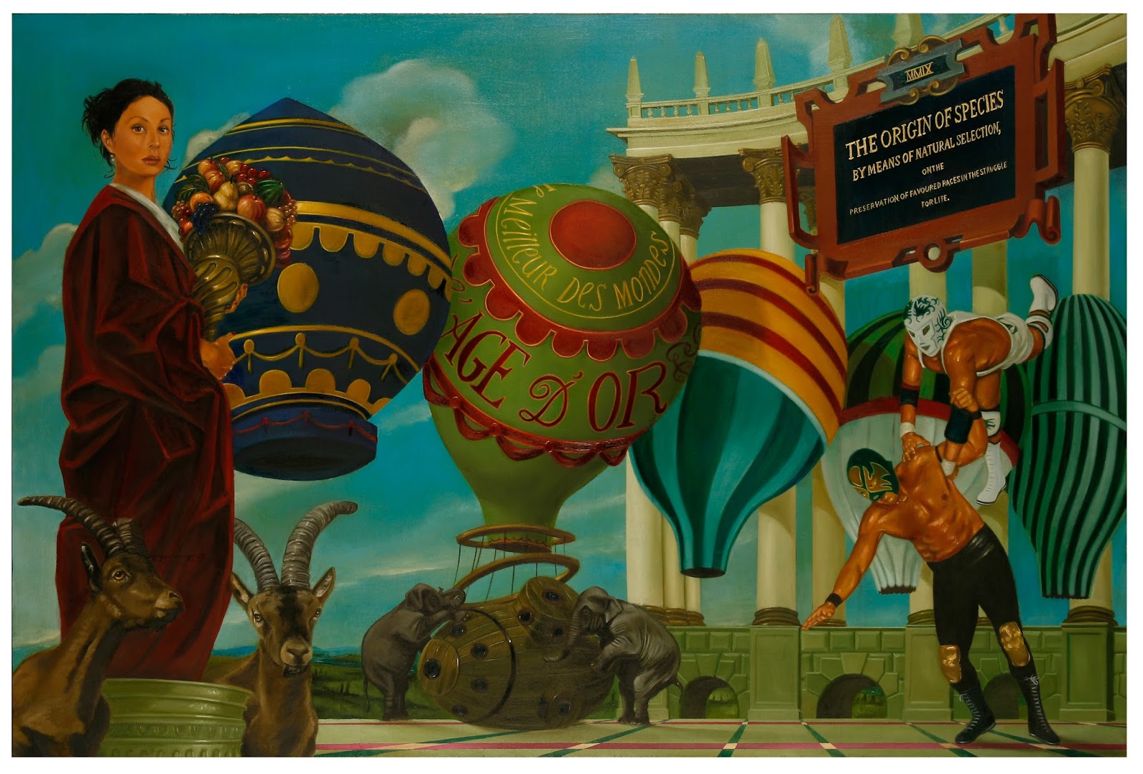 Los lienzos de Gonzalo Rueda se alimentan del humor y de la descontextualización (histórica, geográfica y cultural), herramientas que el artista emplea para crear ácidas paradojas y reubicaciones surrealistas cargadas de ingenio y cultura pop. El sentido del absurdo y la carga de profundidad de su mensaje se acrecienta gracias a la notable técnica pictórica de Rueda, quien, con su detallismo figurativo y su paleta de verdes turquesas, dorados y ocres carne, consigue crear auténticos bodegones del exceso, retratos del disparate y orgiásticos bestiarios.