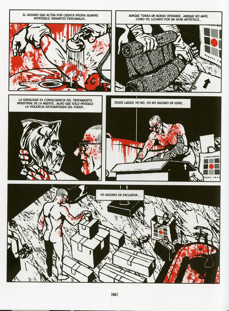 Dentro del contexto profundamente violento del cómic descubrimos una de las tesis básicas de este cómic: la muerte como fenómeno imprevisible o improvisado puede ser un arte y un acto creativo, pero los crímenes políticos, ideológicos o institucionales (interesados, en definitiva) son puro y cruel ensañamiento: