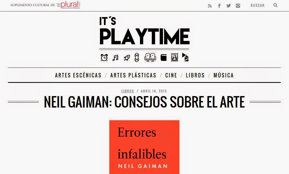 Próximamente: La ciudad de las desapariciones El naufragio En Playtime: Neil Gaiman blogsculturamas 14 abril, 2015 Escrito en el viento 1142 Views Comments Closed Hoy escribo sobre Errores infalibles para (y por) el arte: aquí.