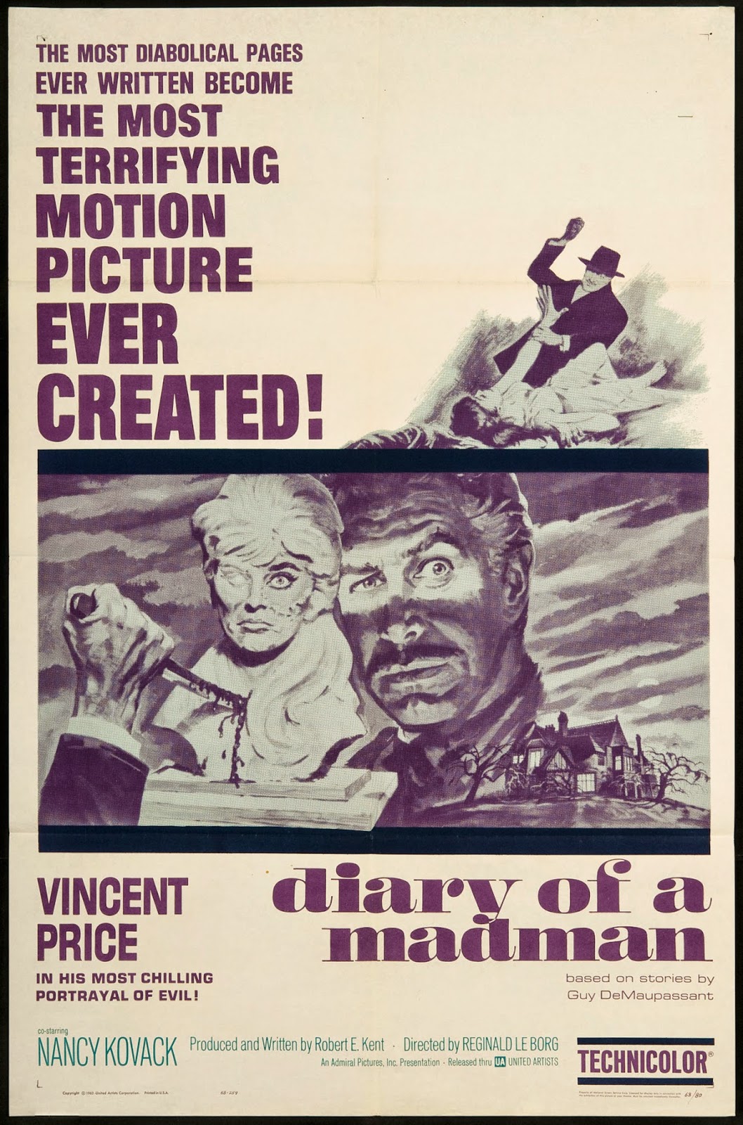 Una de ellas es esta que ahora reseñamos, Diario de un loco (Diary of a Madman, 1963), de Reginald Le Borg, protagonizada por el gran Vincent Price, que adapta dos de los más celebrados cuentos de Maupassant, El Horla y Loco, dando lugar a un híbrido de lo más apetecible y morboso.