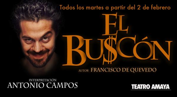 El Buscón, de Quevedo, es una apasionante aventura en nuestra sociedad actual que muestra este país de pícaros con una interesante versión: moderna en sus planteamientos y demoledora en su conclusión. Escrita por Francisco de Quevedo en el Siglo de Oro y adaptada al teatro por Juanma Cifuentes. El Buscón es un personaje que se busca a sí mismo con la redención de un ser que sólo desea salir de la condición que le ha tocado vivir. El espectador podrá perderse en el maravilloso mundo de la imaginación y soñar junto al actor Antonio Campos interpretando a 36 personajes, reírse al contemplar las desgracias a las que se enfrenta el personaje. A la manera que se intentaba hacer reír por aquella época. A la manera de Quevedo.