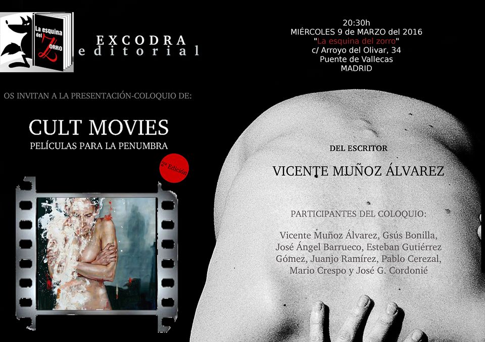 El próximo miércoles 9 de marzo, a las 20:30, el escritor Vicente Muñoz Álvarez estará en la librería vallecana La esquina del zorro (calle Arroyo del Olivar, 34) para presentar la segunda edición de su libro Películas para la penumbra y lo hará acompañado de Gsús Bonilla, José Ángel Barrueco, Esteban Gutiérrez Gómez, Juanjo Ramírez Mascaró, Pablo Cerezal, Mario Crespo, José G. Cordonié y el editor Rubén Darío Fernández. Se hablará del libro, por supuesto, pero también, y en palabras del propio Vicente, «de ese cine de género y culto que a todos tanto nos gusta. Y brindaremos antes, durante y después, por la amistad y la buena literatura».