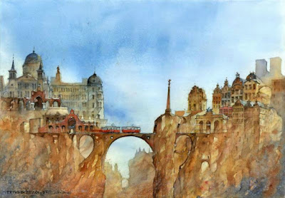 Los laberintos urbanos surrealistas del diseñador y animador japonés Mitamakura (de quien desconocemos casi todo) esconden, detrás de su apariencia gótica, un universo en el que conviven la fantasía de Lewis Carroll y la estilización simbolista del medioevo mágico; y su plasmación en los mundos de ficción de Tolkien o Robert E. Howard. Todo ello filtrado por la sensibilidad japonesa de su autor y la sempiterna influencia de la obra de Miyazaki. Están detenidas las ciudades de Mitamakura en un limbo arquitectónico entre el contrapicado de la pesadilla dantesca que nos empuja hacia abajo y el laberinto lúdico que invita a subir y a perderse entre sus callejones y pasarelas. Nos recuerdan mucho a otras ciudades imposibles, las que se levantan en los complejos mundos en miniatura del gran Santiago Valenzuela.