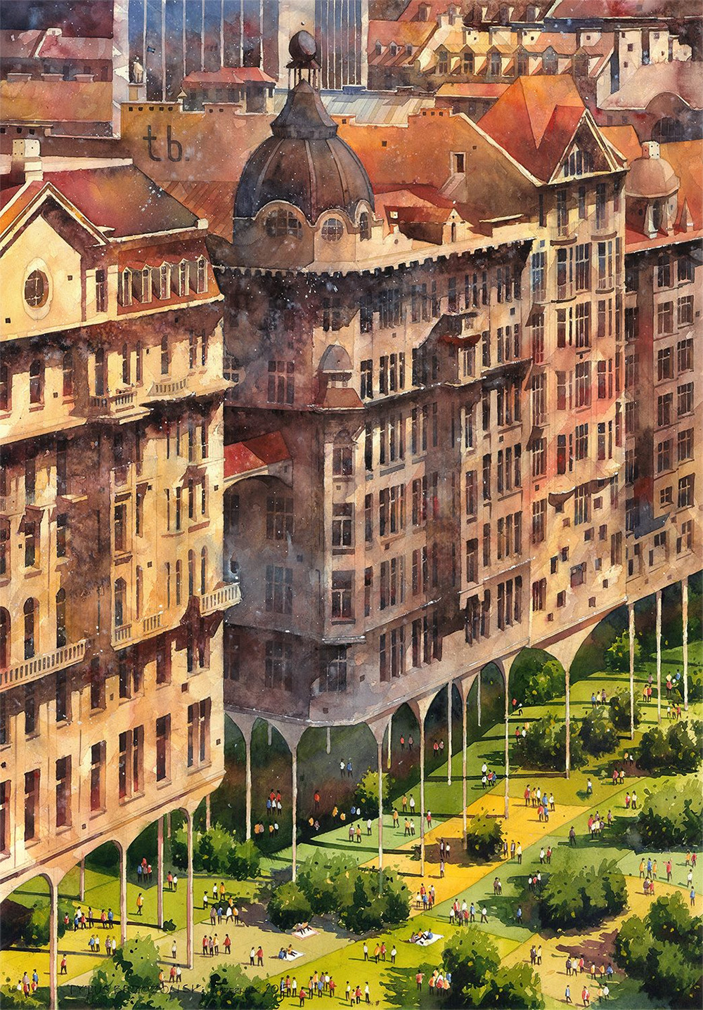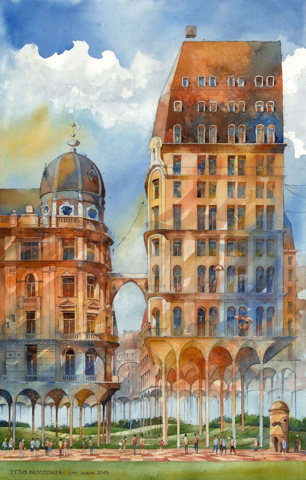 La Polonia reinventada por las acuarelas del pintor y arquitecto Tytus Brzozowski está llena de luz. Se despliegan sus construcciones en un modernismo futurista que descansa en milagroso equilibrio sobre arcadas inacabables, acueductos estilizados y pasarelas colgadas del aire. La pintura de Brzozowski respira con una luz y unas atmósferas casi renacentistas, pero nunca abandona una muy habitable idealización utópica reforzada por la coexistencia del ladrillo y el jardín, la pizarra y el árbol.