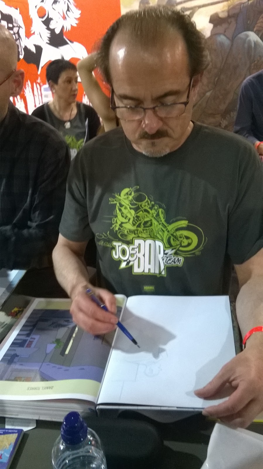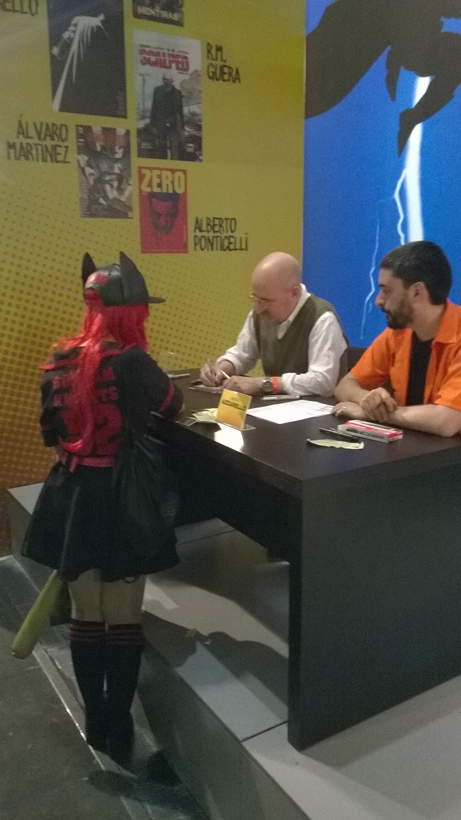 Así, con esa sensación de “pues-a-lo-mejor-sí-que-hay-que-volver-el-año-que-viene”, que suele seguir al hastío cansino de un mediodía con lata y bocata en el suelo de una nave industrial, paseamos, compramos tebeos (de los que ya les hablaremos aquí) e hicimos tiempo hasta la hora de la conferencia a pachas Miller-Azarello. Colas y más expectación, pero, amigos, teníamos un ticket de primera fila. No se lo pusieron fácil los agasajados al presentador de la charla ni al traductor, pero, poco a poco, los dos dibujantes se soltaron y fueron desglosando planes, opiniones y agradecimientos. Dejó entrever Miller, por ejemplo, que a lo mejor Sin City vuelve a aparecer en un mapa. Confesó muy serio, entre las risas (perplejas o cómplices) de la audiencia, que en su carrera ha trabajado más con DC porque son los que tienen buenos personajes. Durante la ronda de preguntas de un público, que después de la pugna por ganarse un sitio tuvo que hacer cola ordenada en el pasillo para preguntar por turnos, Azzarello tuvo tiempo hasta de hablar bien del cómic español y de un autor como David Rubín (nos sumamos al club de fans), quien entre el público y algo descolocado por la situación (la escena no estaba preparada) agradeció los halagos a un sonriente Azzarello. Después, distendido ya el ambiente y con la carcajada a flor de piel, Azarello le soltó un “sonofabitch” amistoso a un agudo e impertinente joven preguntador, pero esa ya es otra historia...