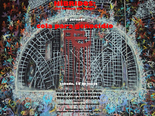 Interpretaré íntegramente la suite para piano en do menor “cola para genocidio”. Se trata de una colección de seis piezas para piano solo que se acompañan de un texto que se puede leer en la pantalla o que es declamado a lo largo de la pieza. Las imágenes, la música y el texto están perfectamente ensambladas para hacer un todo, al igual que la suite en su conjunto. La duración aproximada es de media hora. Después interpretaré una serie de piezas musicoplastidramáticas para completar el espectáculo.