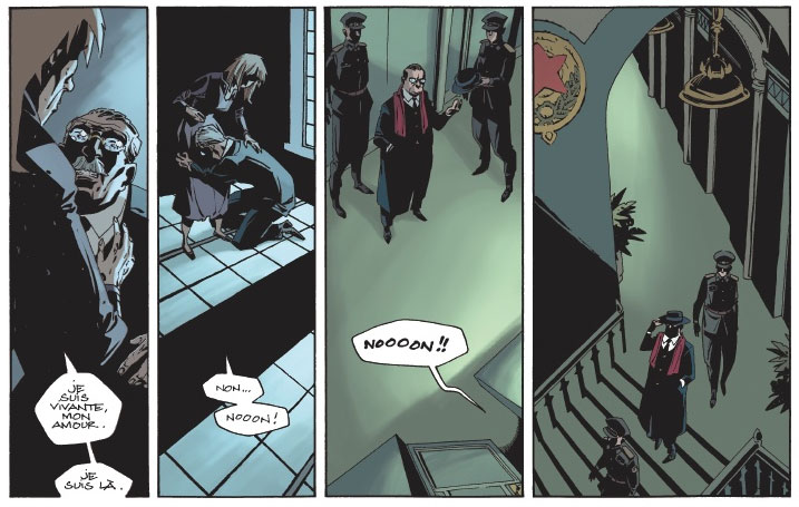 La muerte de Stalin plantea el escenario histórico de los últimos días del dictador y las luchas intestinas de Politburó soviético por rellenar el vacío y ocupar las posiciones de poder. Las crías de la serpiente devorándose unas a otras en el nido junto al padre muerto. El guión de Fabien Nury captura la atmósfera sofocante y totalitaria de un régimen enloquecido, burocratizado hasta la paranoía y en proceso continuo de autocombustión fraticida. Lo hace con un ritmo trepidante y con un humor negro que encaja perfectamente con las situaciones kafkianas del caos y la confusión que sucedieron a la muerte de Stalin (tan deseada por muchos de los suyos). Asistimos a los manejos de Beria para hacerse con el poder y al contraataque de Khrushchev, somos testigos del dolor fanatizado de Molotov y de la reacción descontrolada de Vassia, el cruel hijo de Stalin.