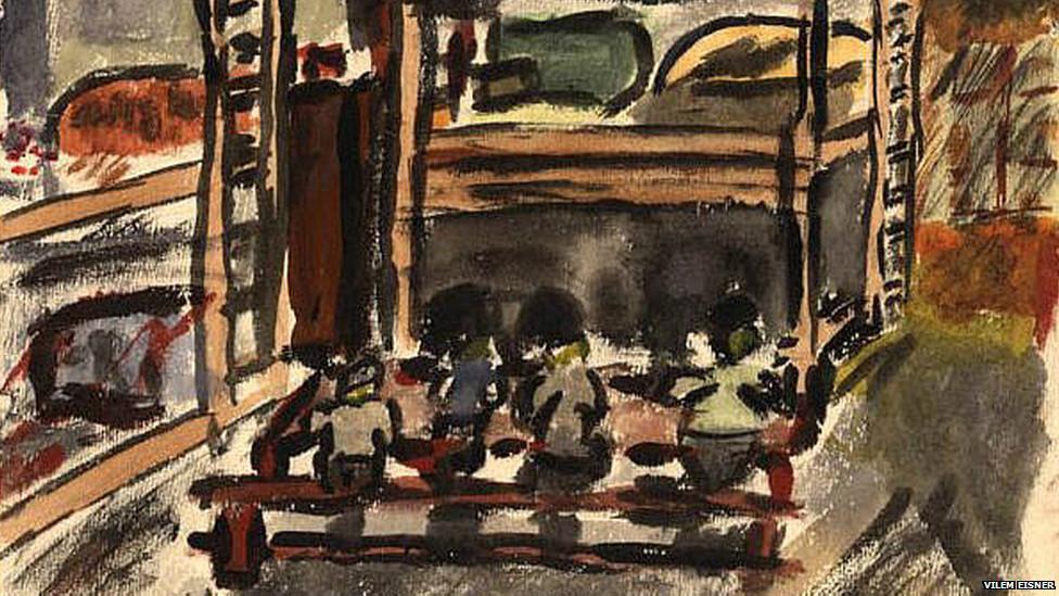 | Vilem Eisner dibujó Una lección en el dormitorio, poco antes de morir a los 13 años en el getto de Theresienstadt |