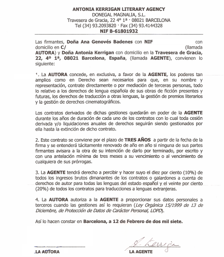 No seré una juntaletras pésima cuando dicho contrato se rubricó con el borrador de la novela El legado de la rosa negra. Primero, leyeron las galeradas. Después, el manuscrito fue examinado por el equipo de lectores expertos de la Agencia; pasó el corte favorablemente. El absurdo: a posteriori, nunca remití a Antonia Kerrigan, una de las mejores Agentes Literarias de España, la revisión de esta u otra obra.