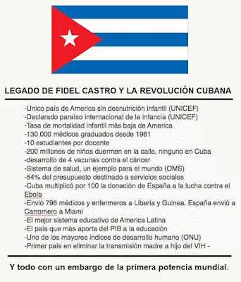 Me lo envían amigos y conocidos. Son de izquierdas. Lo hacen de buena fe pero se equivocan muchísimo. Yo, que también soy de izquierdas, voy a emplear mi blog (que no leen) para decirles que una mente ilustrada el siglo XXI no debe perder el tiempo verificando datos de ninguna propaganda de ningún régimen autoritario. La realidad es que Cuba es una dictadura en la que la gente vive fatal. Dicho esto, el resto de alabanzas a la figura de Fidel Castro y/o a su régimen son nostalgia pura. Un horror para la razón. Esto lo he visto mil veces porque no es sino un copia - pega de los argumentos nostálgicos que le rezan el 20N a Franco, o a la URSS la fecha que sea o a etc cuando quiera que toque atacar los fallos de las democracias (ya ven que me controlo y no pongo "Hitler").