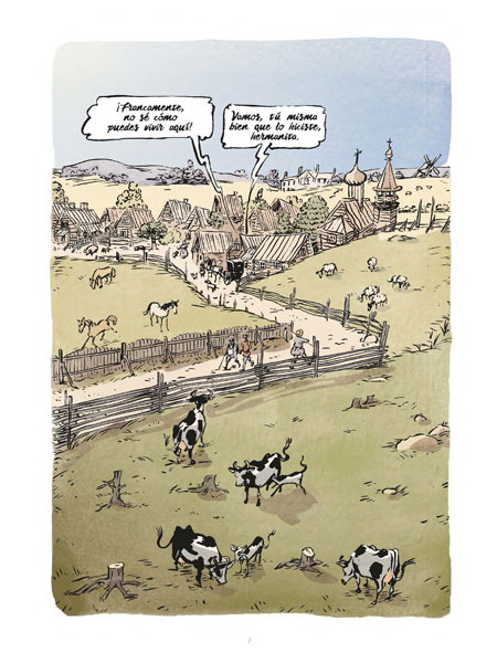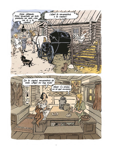 Le habíamos perdido la pista a Martin Veyron hasta que ha llegado a nuestra manos este Cuánta tierra necesita un hombre. Se parece en poco al autor que recordábamos, sobre todo en el plano gráfico. Aquellas escenas cotidianas de línea clara, planos cerrados y entornos íntimos, han dejado paso ahora a un cómic que respira en un contexto rural de grandes espacios abiertos. Abunda el nuevo trabajo de Veyron en escenas paisajistas y estampas de bosques, lagos helados, trigales y estepas. Esos paisaje rurales latifundistas que tan importantes fueron en la narrativa de Tolstói y a los que el propio autor regresó en su vejez cuando la tierra ya no estaba en manos de los grandes terratenientes imperiales. De este modo, el propio escritor respondió a la pregunta de su cuento cuando abandonó todo cuanto tenía (incluida su familia), se despojó de posesiones y de los oropeles de la fama, y regresó a la vida sencilla del campo.
