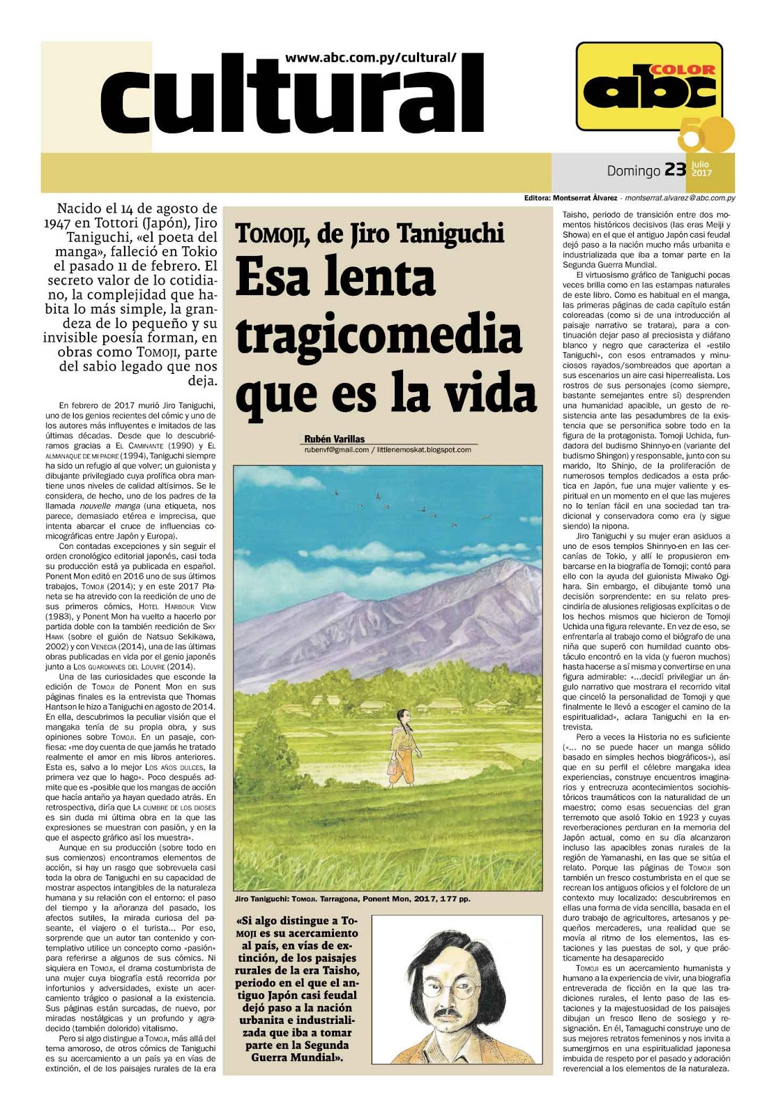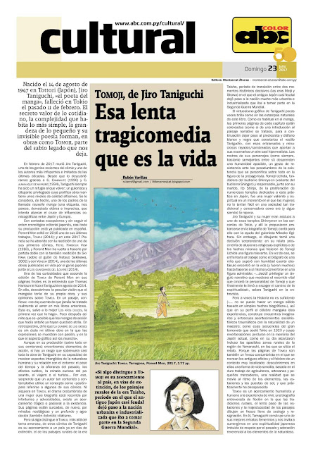 El fin de semana pasado publicamos en ABC Color, nuestro suplemento cultural transatlántico favorito, un artículo dedicado a ese genio del cómic que nos dejó hace unos meses llamado Jiro Taniguchi. Escribimos sobre Tomoji, uno de sus últimos cómis publicados en España. Un tebeo, además, que junto a las muchas virtudes que acompañan los cómics de Taniguchi, presenta algunas peculiaridades que merecen subrayarse respecto al resto de su producción.