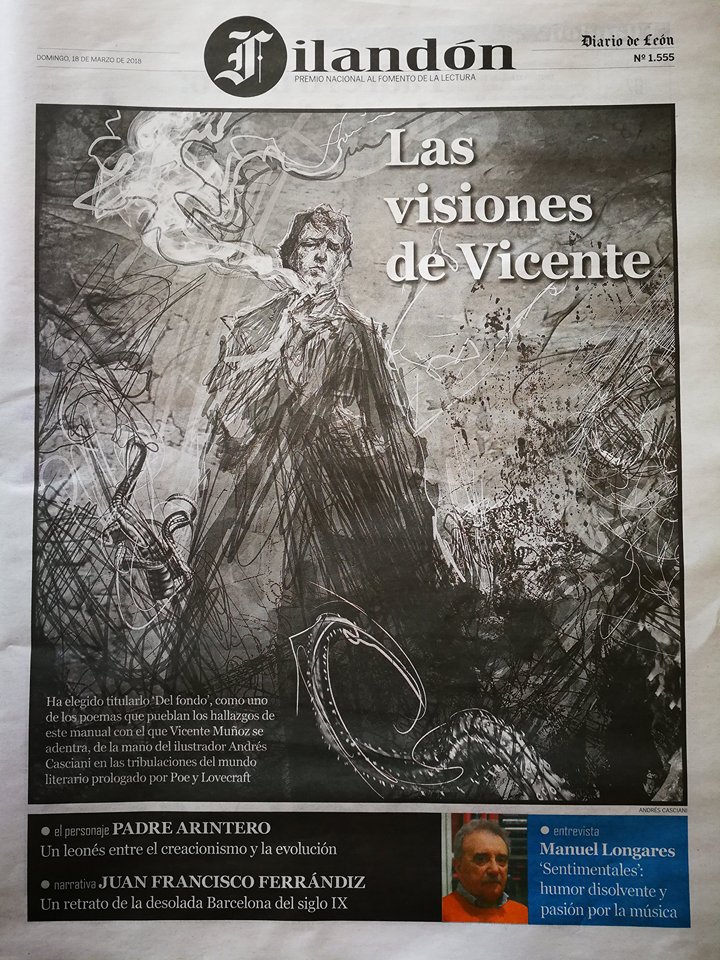 Acaba de publicar Vicente Muñoz su obra más ocura. Del fondo es, según sus palabras, una versión ampliada y revisada de Buscando la luz, un poemario que publicó en formato de bolsillo con Vinalia Trippers, su sello editorial, en 1998. «Editamos entonces 300 ejemplares que pronto se agotaron y ahí quedó todo»... O no, porque hace un par de años Andrés Casciani, un ilustrador argentino habitual de Vinalia Trippers, le propuso ilustrar uno de sus libros. «Estuve pensando durante algún tiempo qué podría encajar mejor en su estilo, expresionista, tenebroso y oscuro, y decidí revisar aquel poemario, que me pareció que le iba como anillo al dedo a su estética», destaca. Así que se lo envió y el ilustrador se mostró entusiasmado. A partir de ese momento comenzó el proceso creativo, que ha durado más de un año. «Cada semana, me enviaba una o dos ilustraciones, hasta completar las más de setenta que incluye el poemario», explica.