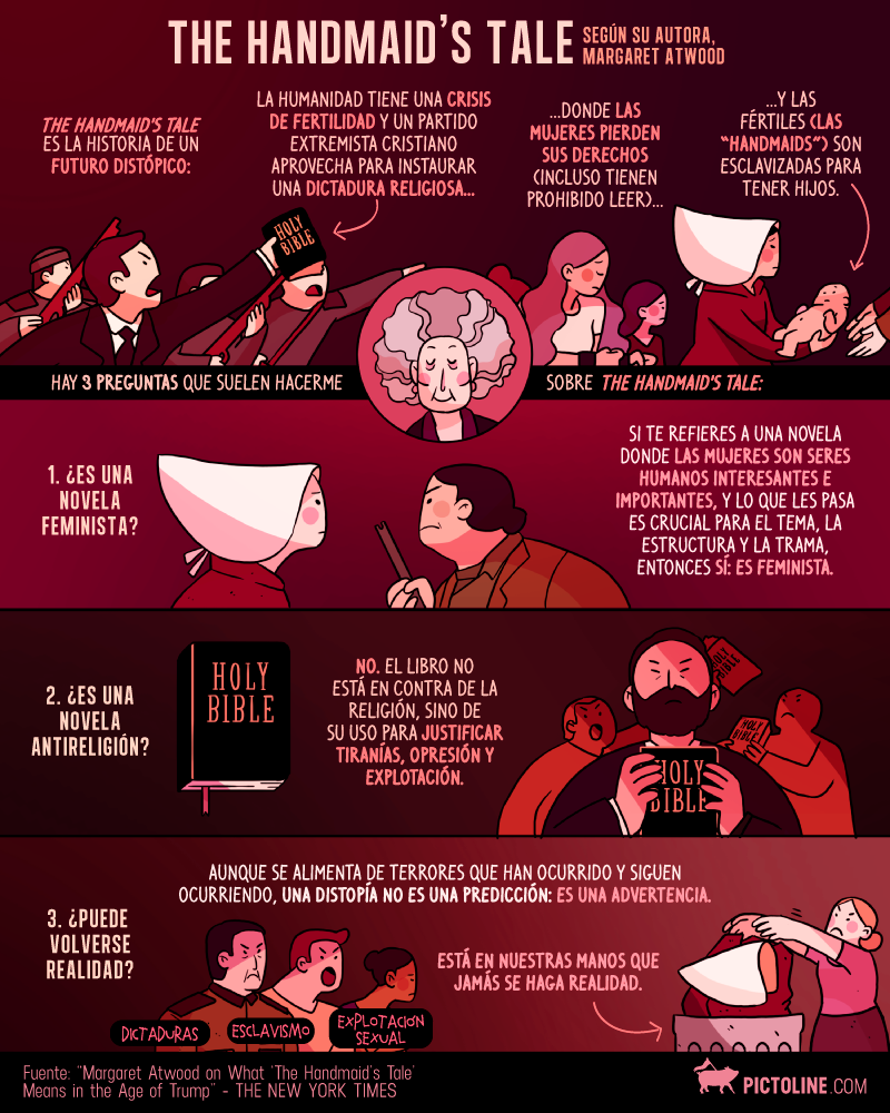 La novela, narrada en primera persona por Defred, la protagonista, a modo de diario entrecortado donde la historia de su pasado se superpone a la del presente con una retahíla de flashbacks y algún que otro flashforward o su propia inventiva…, nos arrastra a las profundidades del abismo de una distopía que nos hace reflexionar acerca del horror del sometimiento. Margaret Atwood fundamenta su terrorífica historia, en cierta medida, desde la perspectiva de la religión panteísta que profesa.