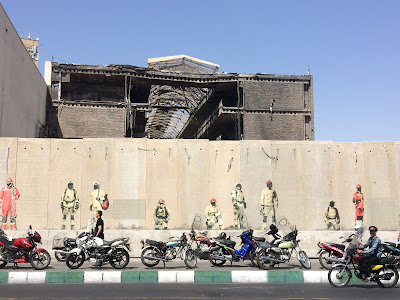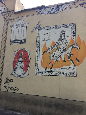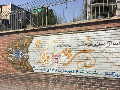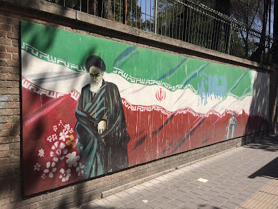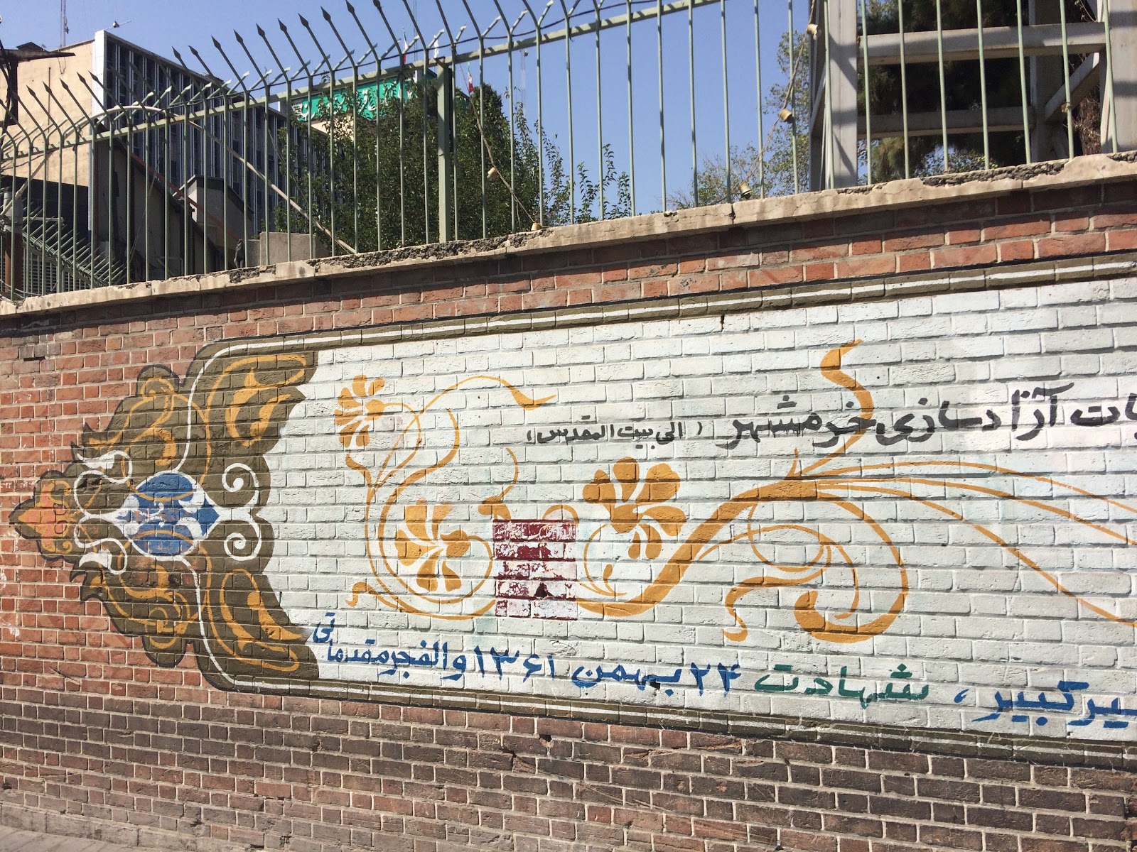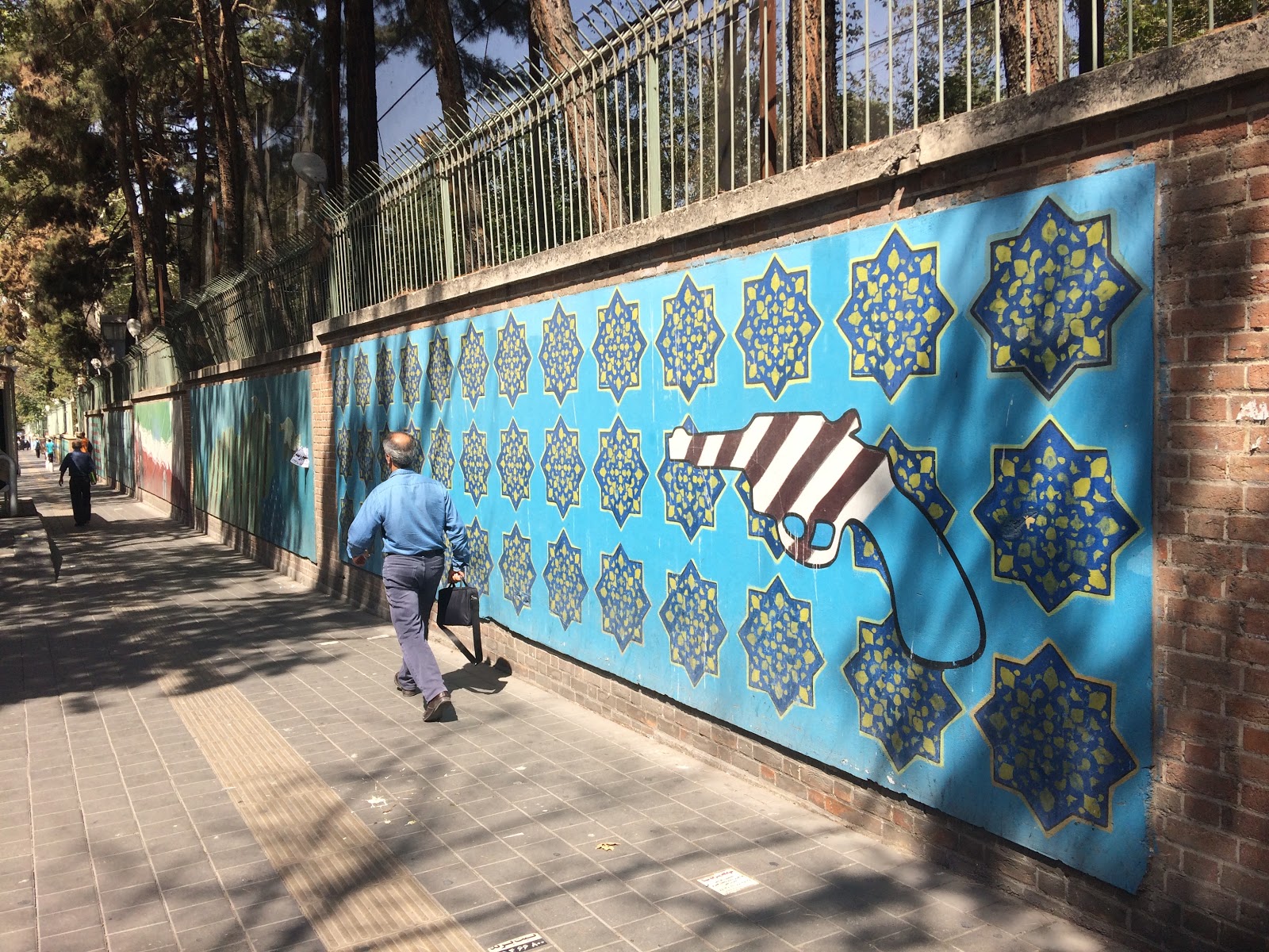 Como sucede con otras grandes metrópolis contemporáneas (estamos pensando en ciudades como Berlín, Saigón o Nueva York), Teherán puede leerse como un mapa de la historia reciente de su región. En sus palacios fastuosos, en sus edificios gubernamentales y en los grafitis que -cada vez con más frecuencia y abundancia ilustran sus muros y edificios- podemos leer la historia de los últimos sahs kayar, la del colonialismo ruso e inglés, la de la llegada de los Pahlevi y la de la revolución de los ayatolas contra los sahs y el intervencionismo estadounidense. Entre los grafitis iraníes, obviamente, encontramos muchas muestras de rechazo a Norteamérica y a las políticas occidentales (sobre todo en los alrededores de la antigua Embajada Estadounidense; ya saben, aquella de la crisis de los rehenes, que luego hemos visto en Argo), pero también muestras de la exuberante caligrafía farsi y motivos decorativos que nos remiten directamente a la arquitectura y la ornamentación persa tradicional.