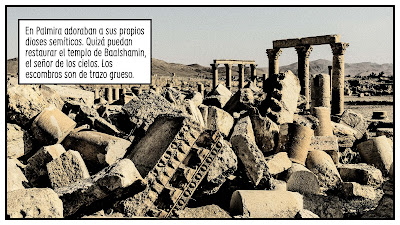 No habíamos vuelto a "visitar" Palmira hasta que, hace unos días, El País publicó "Palmira. El otro lado" en su suplemento semanal. Fue también un reencuentro con sus autores, Carlos Spottorno y Guillermo Abril, a quienes habíamos descubierto con La grieta; esa apasionante fotonovela política que no hace demasiado nos abrió la mente de par en par y nos invitó a adentrarnos en reflexiones doloridas acerca del futuro de Europa. "Palmira. El otro lado" se publicó simultáneamente en España y Alemania (en el Süddeutsche Zeitung Magazin). Con el mismo formato de cómic fotonovelado que usaron en La grieta (y con un tratamiento fotográfico similar), sus autores se embarcan en un reportaje sobre el terreno. Su objetivo: visitar la Palmira después de ISIS. Recordemos que el terrorismo islamista ocupó la ciudad por dos veces y que dinamitó una parte de los monumentos del yacimiento.