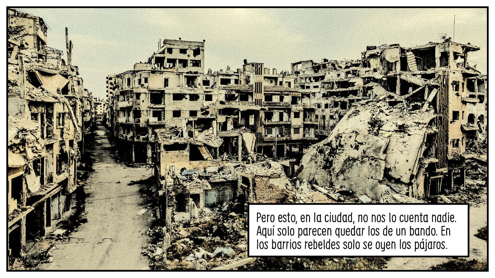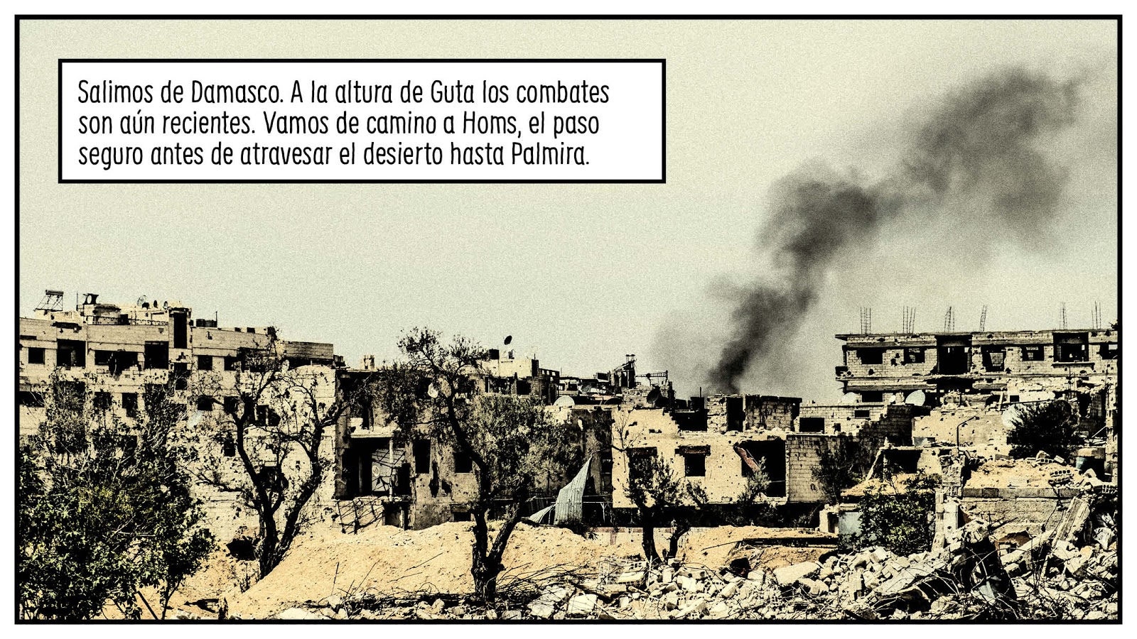 Sin embargo, las ruinas de Palmira (algunas de ellas convertidas en escombros después de la ocupación terrorista) resultan ser sólo la excusa adecuada para ir un paso más lejos y descorrer la cortina que oculta la tragedia Siria a Occidente. Spottorno y Abril se acercan a Damasco para entrevistar a los protagonistas directos del drama: para palpar los matices que construyen las diferentes versiones de una guerra que parece interpretarse de forma divergente según la esquina del mundo desde la que se observe (Europa, Estados Unidos, Ruisa o sobre el terreno devastado). Como sucedía con La grieta, "Palmira. El otro lado" se niega a emitir juicios de valor: como ejercicio periodístico que es, se alimenta de los propios interrogantes que se generan en su recorrido y de los testimonios que ofrecen las gentes que habitan sus viñetas. Será el lector quien habrá de encontrar su camino entre las palabras y las imágenes que llenan sus páginas. Los cronistas visitan el lugar, exponen los documentos, nos muestran las huellas y las imágenes de los escombros, hacen las preguntas... Sin embargo, no se adivinan respuestas claras. Éstas se esconden detrás de los silencios, entre los resquicios del miedo, los intereses políticos y las palabras huecas. Después de leer este cómic se nos reproducen las mismas dudas e inquietudes que nos asaltaban con su anterior trabajo: ¿Está el mundo ya en medio de una guerra silenciosa que amenaza con quebrar los frágiles equilibrios que apenas sujetan la paz en Occidente? ¿Hasta qué punto no son Iraq y Siria los tableros de juego en los que se están ejecutando, entre miles de víctimas reales, los primeros movimientos de esa guerra tácita ya desencadenada?