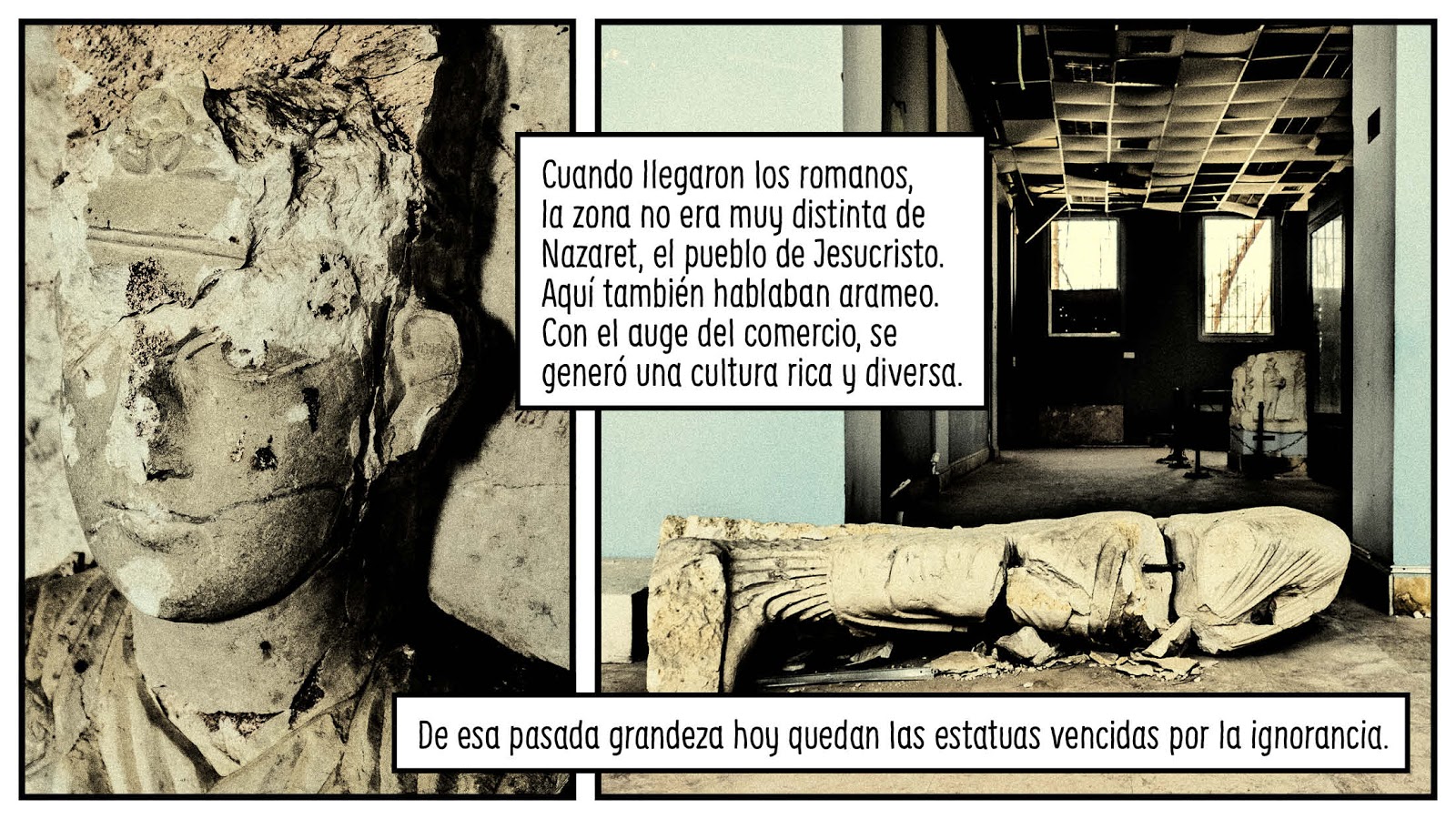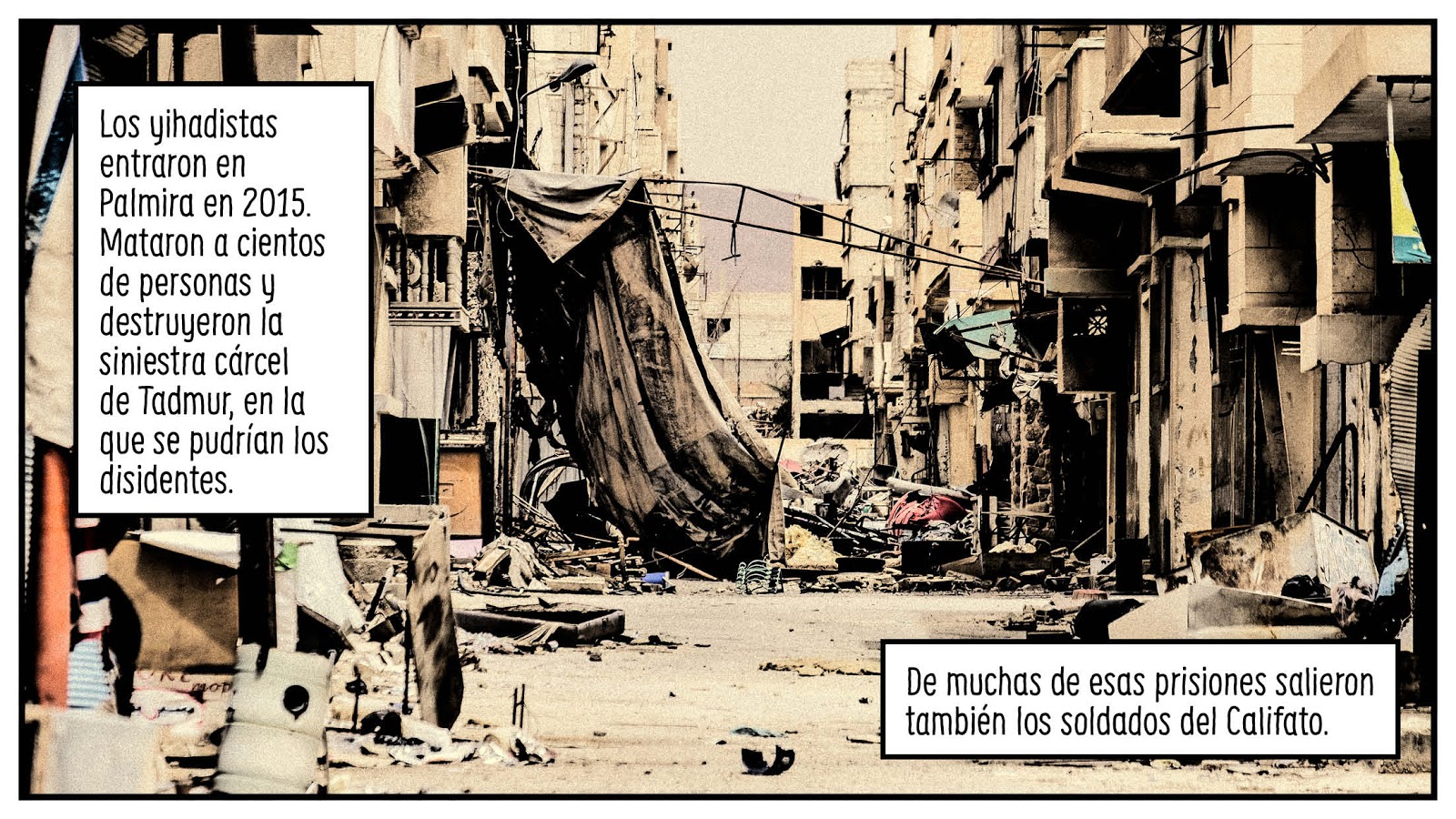 No habíamos vuelto a "visitar" Palmira hasta que, hace unos días, El País publicó "Palmira. El otro lado" en su suplemento semanal. Fue también un reencuentro con sus autores, Carlos Spottorno y Guillermo Abril, a quienes habíamos descubierto con La grieta; esa apasionante fotonovela política que no hace demasiado nos abrió la mente de par en par y nos invitó a adentrarnos en reflexiones doloridas acerca del futuro de Europa. "Palmira. El otro lado" se publicó simultáneamente en España y Alemania (en el Süddeutsche Zeitung Magazin). Con el mismo formato de cómic fotonovelado que usaron en La grieta (y con un tratamiento fotográfico similar), sus autores se embarcan en un reportaje sobre el terreno. Su objetivo: visitar la Palmira después de ISIS. Recordemos que el terrorismo islamista ocupó la ciudad por dos veces y que dinamitó una parte de los monumentos del yacimiento.