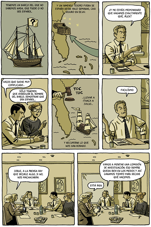 Eran los años de la segunda legislatura del Gobierno de Zapatero, el periodo previo a la crisis que acabó con su etapa de gobierno. Su Ministro de Cultura, uno de los mejores que hemos tenido, fue el escritor César Antonio Molina (mencionado en los agradecimientos junto a la Ministra de Cultura que le sucedió, Ángeles González-Sinde). Su presencia en esta historia y en el cómic (aunque no llegue a mencionarse su nombre real de forma explícita) será fundamental. Junto a él compartió quebrantos e indagaciones Guillermo Corral, en una búsqueda contrarreloj de resquicios legales que permitieran la restitución del tesoro a su propietario original. La historia relata este proceso con detalle: el descubrimiento del expolio que Odyssey (Ithaca en el cómic) estaba llevando a cabo; la investigación y documentación que numerosos expertos españoles tuvieron que llevar a cabo ante el secretismo de la Compañía y sus argucias; los complejos procedimientos legales que siguieron, con las múltiples vistas y los recursos que se celebraron en Estados Unidos; y el accidentado traslado final del tesoro a territorio español.