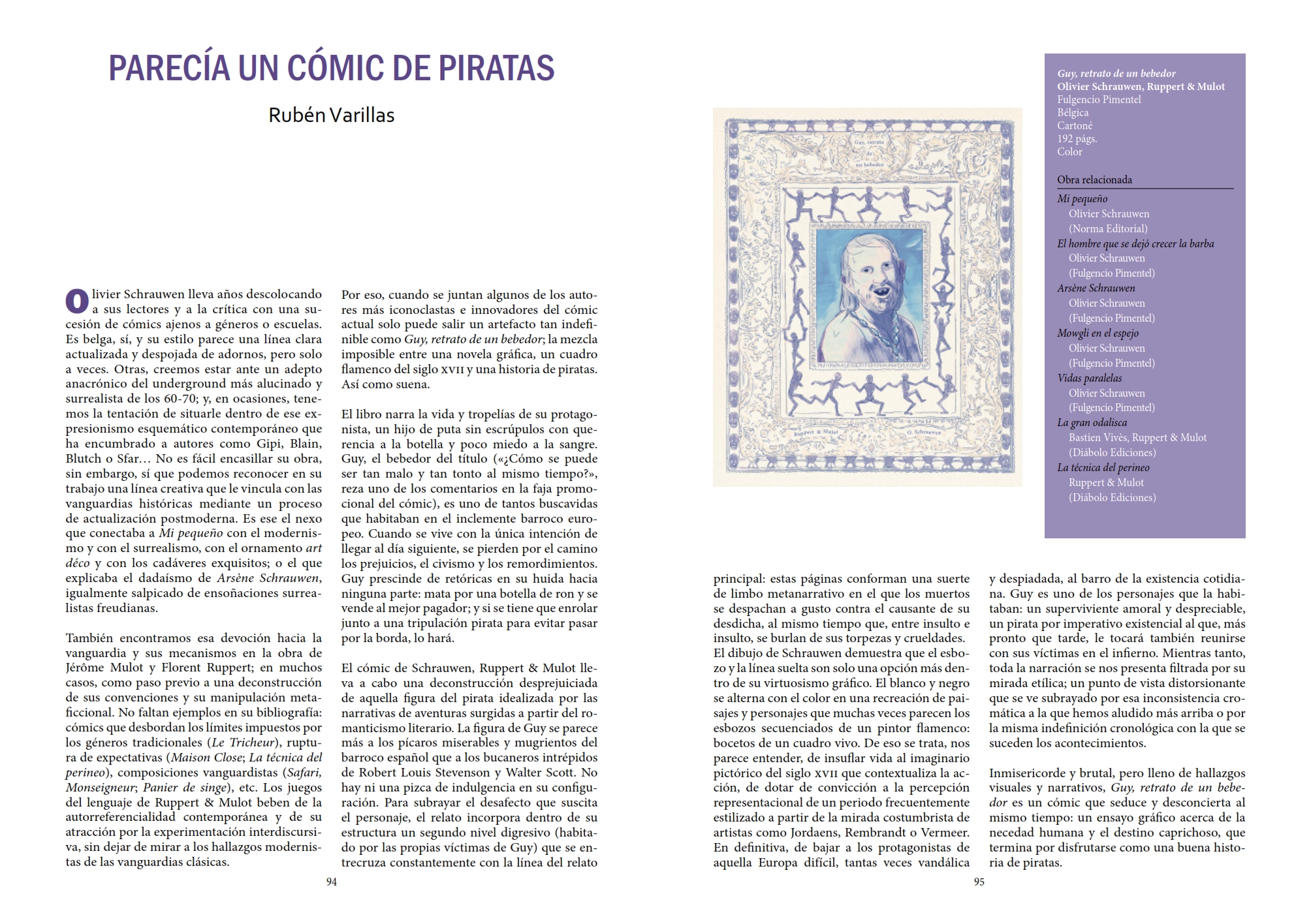 También encontramos esa devoción hacia la vanguardia y sus mecanismos en la obra de Jérôme Mulot y Florent Ruppert; en muchos casos, como paso previo a una deconstrucción de sus convenciones y su manipulación metaficcional. No faltan ejemplos en su bibliografía: cómics que desbordan los límites impuestos por los géneros tradicionales (Le Tricheur), ruptura de expectativas (Maison Close; La técnica del perineo), composiciones vanguardistas (Safari, Monseigneur; Panier de singe), etc. Los juegos del lenguaje de Ruppert & Mulot beben de la autorreferencialidad contemporánea y de su atracción por la experimentación interdiscursiva, sin dejar de mirar a los hallazgos modernistas de las vanguardias clásicas...