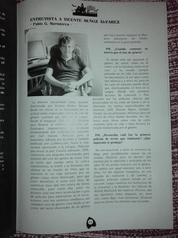 Ya desde niño me apasionó el género de terror, tanto en el cómic y en la literatura como en el cine, y ha estado siempre presente en mi vida. Las razones las desconozco, el por qué a unos nos interesa y a otros no, pero en mi caso en concreto puedo decir que, efectivamente, lo llevo en la sangre. Desde mis primeras lecturas de Lovecraft y Poe, pasando por las películas clásicas que proyectaban en los cines de barrio y en la televisión, los cómics especializados de entonces, SOS, Dossier Negro, Vampus, Creepy, las escalofriantes Historias para no dormir de Chicho Ibáñéz Serrador, etc, etc, hasta estos libros sobre cine de culto recientes, toda mi vida y obra literaria ha estado mediatizada por el género.