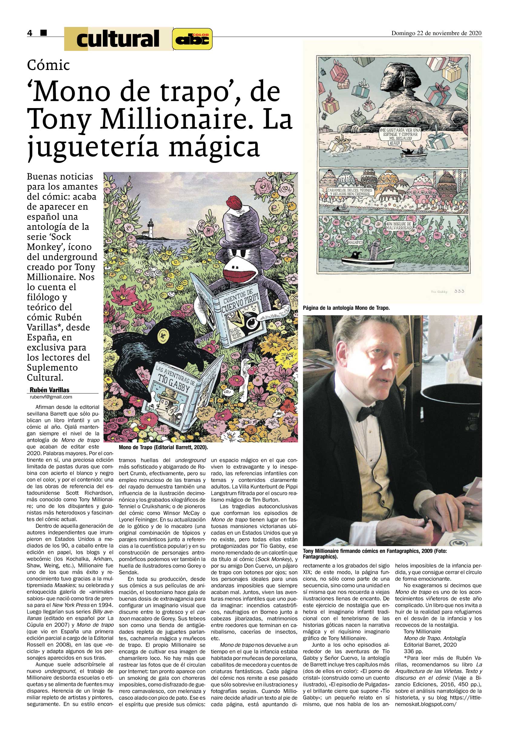 Mono de trapo nos devuelve a un tiempo en el que la infancia estaba habitada por muñecas de porcelana, caballitos de mecedora y cuentos de criaturas fantásticas. Cada página del cómic nos remite a ese pasado que sólo sobrevive en ilustraciones y fotografías sepias. Cuando Millionaire decide añadir un texto al pie de cada página, está apuntando directamente a los grabados del siglo XIX; de este modo, la página funciona, no sólo como parte de una secuencia, sino como una unidad en sí misma que nos recuerda a viejas ilustraciones llenas de encanto. De este ejercicio de nostalgia que enhebra el imaginario infantil tradicional con el tenebrismo de las historias góticas nace la narrativa mágica y el riquísimo imaginario gráfico de Tony Millionaire.