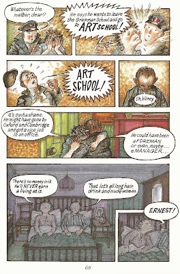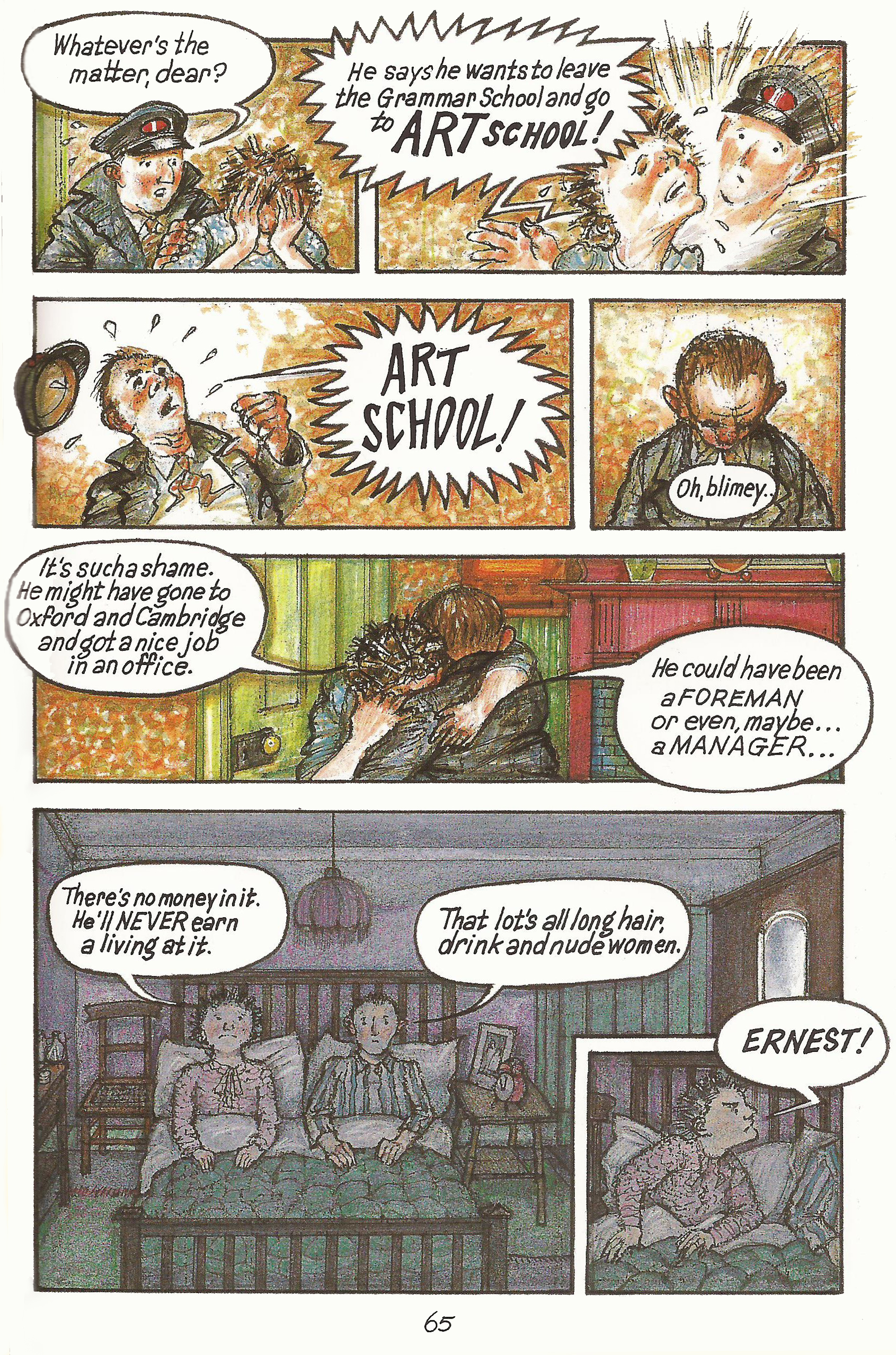 Si bien es cierto que muchos de los motivos temáticos que mencionamos ya habían aparecido en Gentleman Jim y en When the Wind Blows[2], su repetición en Ethel & Ernestresponde a una propuesta más amplia y cohesiva que prescindirá de otros subtextos (como el de la especulación fantasiosa), para centrarse exclusivamente en la construcción del perfil existencial de sus personajes. El diseño de éstos es más realista (aunque ligeramente impresionista en su trazo) que el de los personajes de obras precedentes. Aunque podemos ver claramente en ellos el reflejo del Jim Bloggs de Gentleman Jim o de los Jim y Hilda de When the Wind Blows, en esta ocasión la mirada de Briggs sobre sus personajes es más benévola. La ternura sustituye a la ironía, y el humor de Ethel & Ernest resulta más indulgente con la dignidad esforzada de sus ineducados protagonistas.