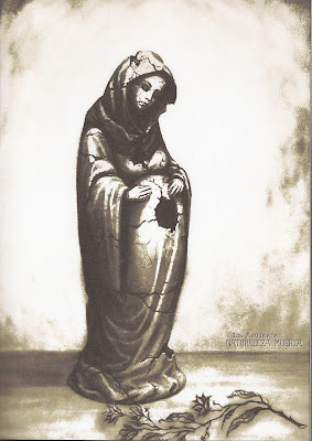 No podemos dejar de mirar y repensar la ilustración que la ilustradora y dibujante de cómics Raquel Alzate ha publicado recientemente en La Residencia de Historietistas (esa exclusiva e impredecible revista-boletín de la que con tanto entusiasmo les hablamos aquí). En la producción de la Vizcaína siempre han abunddo los motivos gótico-románticos en una aproximación a la cuentística, la religión y el folclore popular cargada de tenebrismo. Su estilo gráfico, a medio camino entre un pictoricismo de claroscuros barrocos y el ala más perversa del surrealismo-pop, funcionaba a la perfección en aquel cuento trágico de resonancias medievales que fue Cruz del sur; un cómic a todas luces minusvalorado.